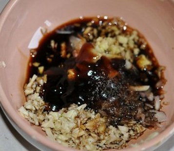 – Chuẩn bị cái chén, pha vào đó hỗn hợp: 4 thìa súp xì dầu + 1 thìa súp dầu hào + 1 thìa súp dầu olive (hoặc dầu mè) + 2 thìa súp rượu + 2 thìa cafe bột nêm + 2 thìa cafe muối + tiêu + tỏi băm. Trộn cho đều thành nước ướp.